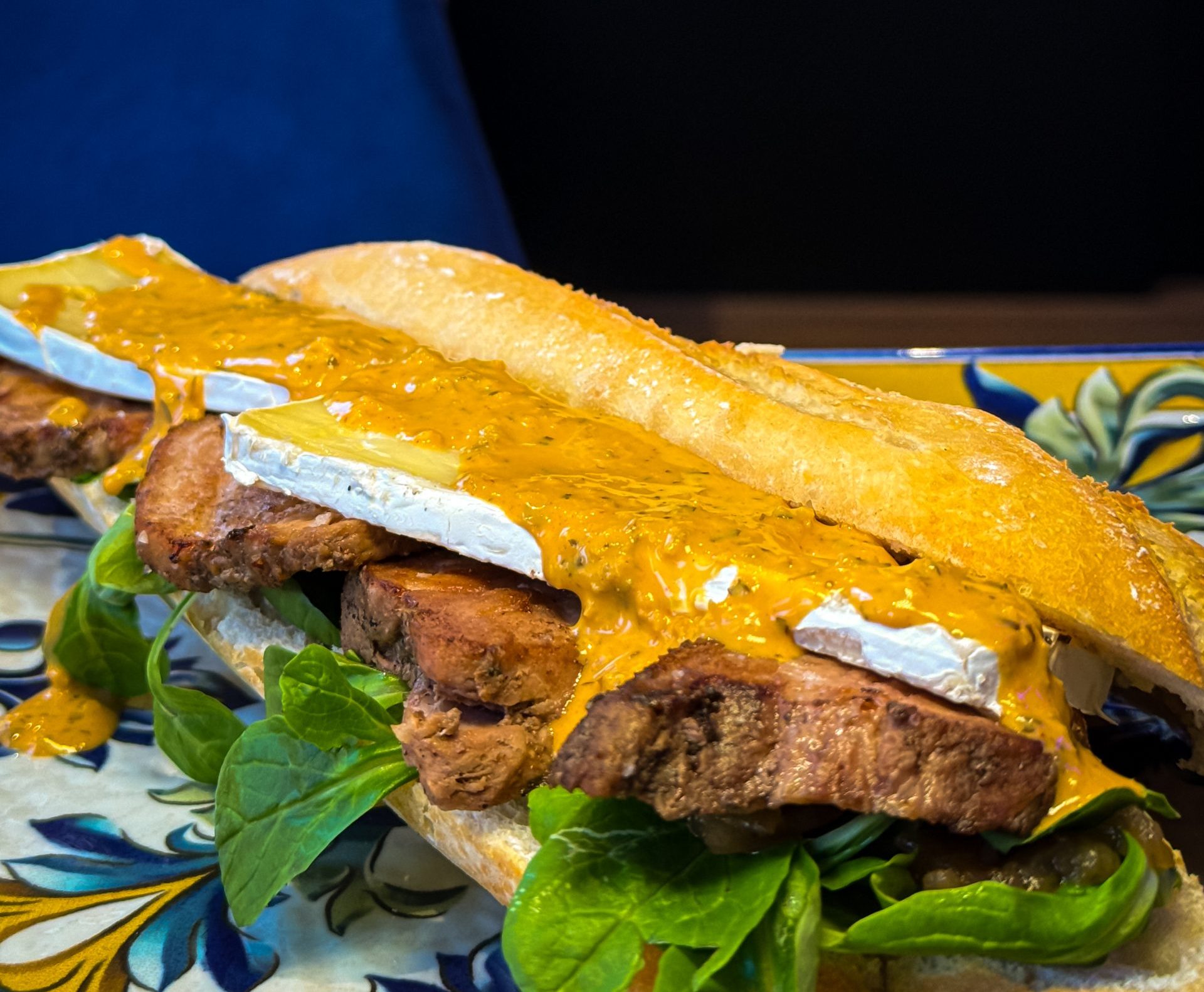 Baguette rustica, canónigos, nuestra Presa a baja temperatura 12h, cebolla caramelizada al Montilla Moriles, queso Brie y una emulsión de Chimichurri.